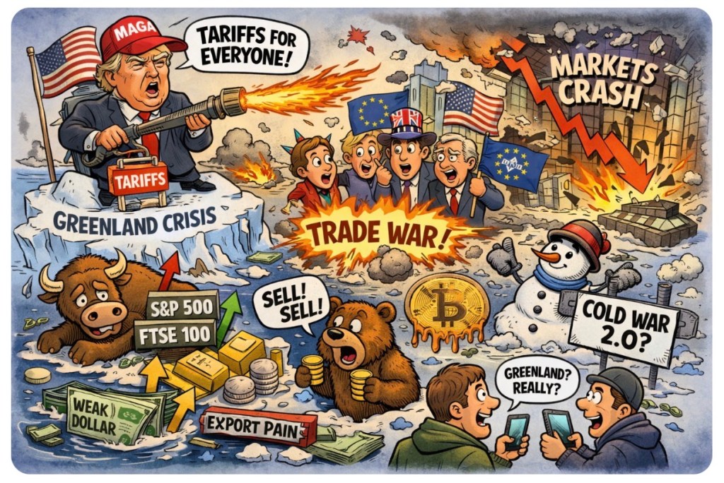 🌍💣Just when you thought 2026 might cool down geopolitically, President Trump reignites the world’s anxiety by proposing tariffs on long-time allies — this time over a territorial squabble involving Greenland. Yes, Greenland — the icy, sparsely populated chunk of land that’s now somehow at the heart of a new trade war. Markets didn’t just blink. They projectile vomited.