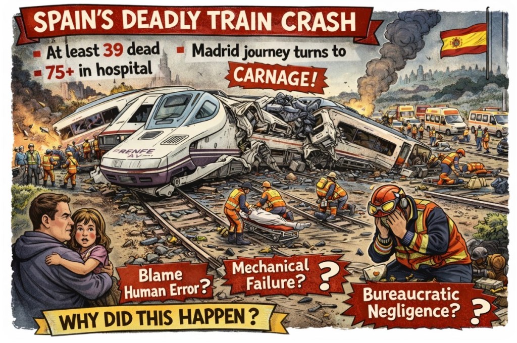 At least 39 lives have been violently cut short, and around 75 people are still clinging to life in hospital beds, after a catastrophic train crash shattered the illusion of sleek, modern transport safety in Spain. The tragedy unfolded when a high-speed train travelling toward Madrid derailed—plunging carriages off the track like twisted toys—only to be struck by a second train, triggering a chain of devastation.