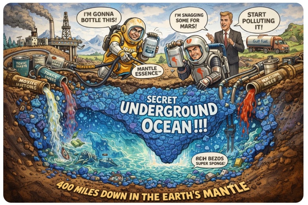 🌍💧🧽Scientists just uncovered the biggest blue sponge since SpongeBob—3 times more water than all Earth’s surface oceans, chilling 400 miles underground inside a rock named ringwoodite (which sounds suspiciously like a failed Marvel villain). But of course, instead of wonder, awe, or even mild curiosity, humanity’s first impulse? “Neat. Let’s figure out how to mess this up too.” 💀🚰