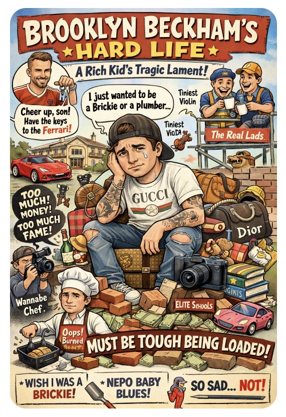 Apparently, the weight of never having to worry about bills or real-life consequences has become too heavy a burden for our man Brooklyn. “If only I could have been a brickie,” he sighs from his £10M Beverly Hills mansion, probably while wearing socks more expensive than your rent. The horror of fancy schools, couture clothes, and having David Beckham as your dad? Unimaginable. 🫠