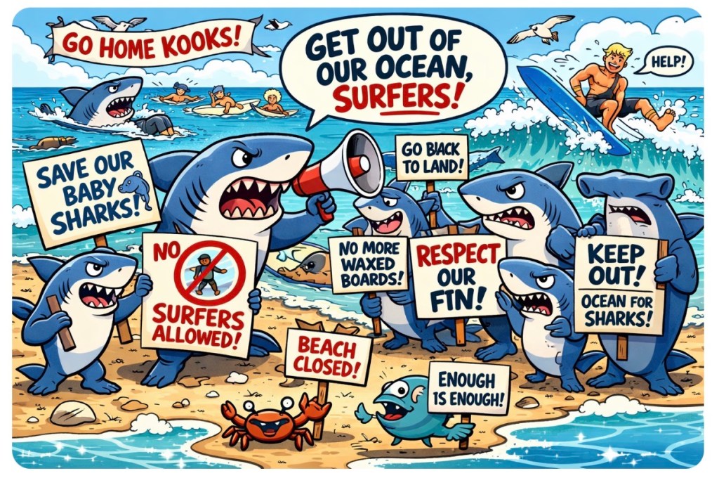 Picture this: youโre a shark. Youโre vibing with your pups in the turquoise shallows, minding your own fishy business, when Todd from Bondi paddles over with a GoPro, shouting โYeeeeew!โ and dripping coconut-scented oil into your nursery. The audacity.