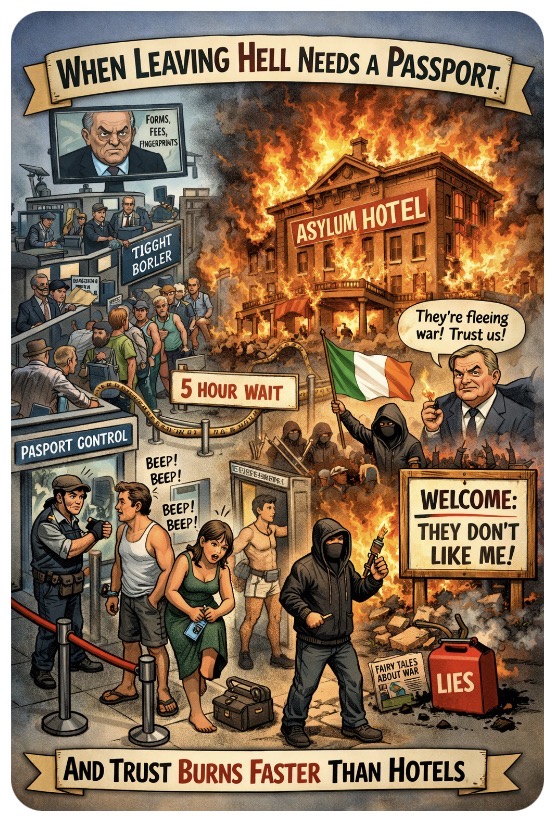They’re not lighting fires because they love chaos — the Irish are lighting them because they’re sick of being told fairy tales while standing barefoot in airport queues designed by politician to suck the moral soul right from your body.