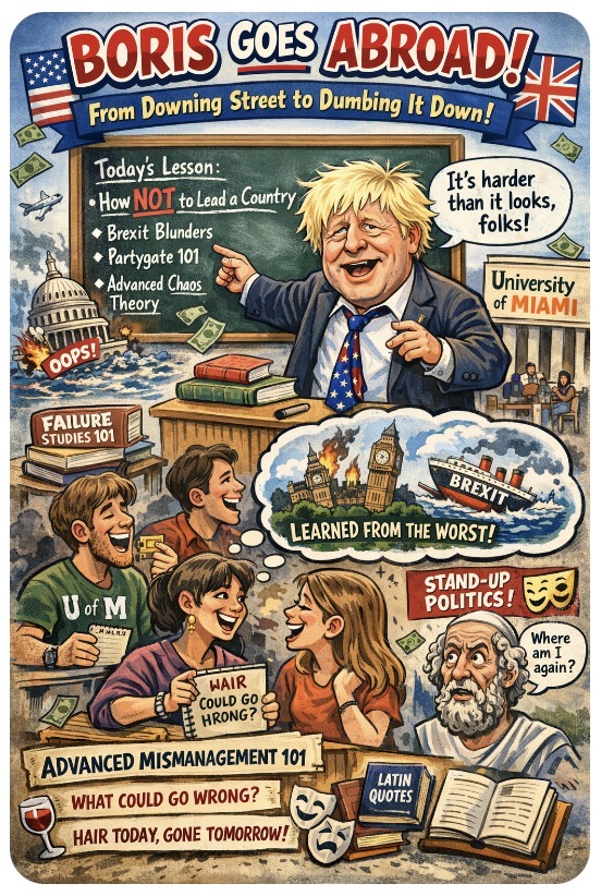 Letβs be honest: Borisβ true credentials lie in how not to lead a country. He treated governing like an improv show with no script and an endless tab at the taxpayer-funded bar. And now heβs flown across the Atlantic to drop pearls of disheveled wisdom on unsuspecting undergrads whose only crime was signing up for a political science elective.