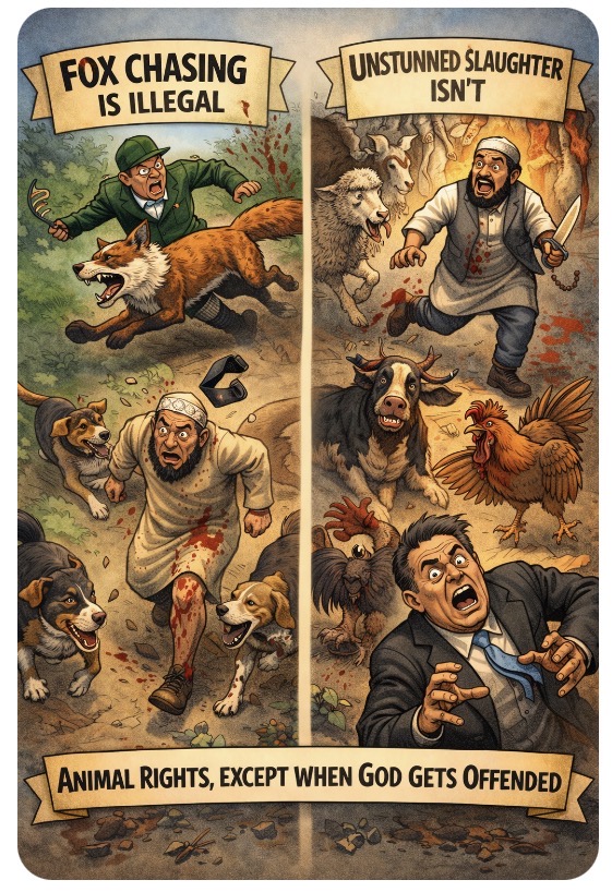 Weβll ban a man for letting his dog chase a fox β but weβll bend over backwards to allow unstunned slaughter if it ticks the right βreligious toleranceβ box.