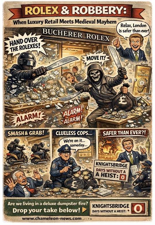 Nothing says “London’s totally fine, thanks” like machete-wielding thugs storming a luxury watch shop in Knightsbridge like it’s the final boss fight in Grand Theft Auto: Regency Edition. While the Mayor insists the city is safer than ever, reality says otherwise—specifically, reality just burst into Bucherer Rolex Boutique with a blade and zero chill.