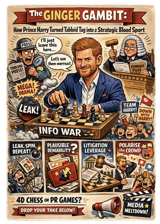 🧠📸Forget the sob stories, forget the frostbitten todger, and forget the Netflix docu-dump. What Prince Harry is playing isn’t victimhood—it’s chess with paparazzi pawns. While critics froth about oversharing and hypocrisy, Harry’s not oversharing at all. He’s baiting, sniping, and deploying emotional landmines with the precision of a man who’s read every editor’s neurosis cover to cover.