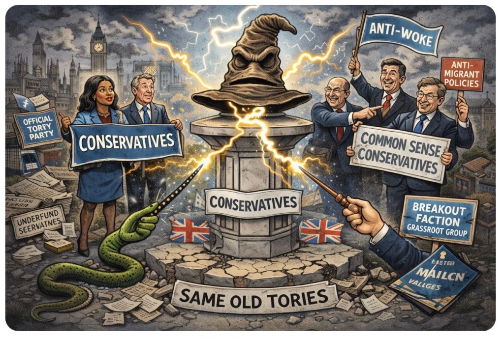 Yes, folks, it’s the same Conservative Party — just with a new robe and wand combo. Enter the Shadow-Shadow Cabinet, trying to out-conservative the conservatives. Less a political party, more a Harry Potter LARP session where everyone thinks they should be head boy. 🪄🏰