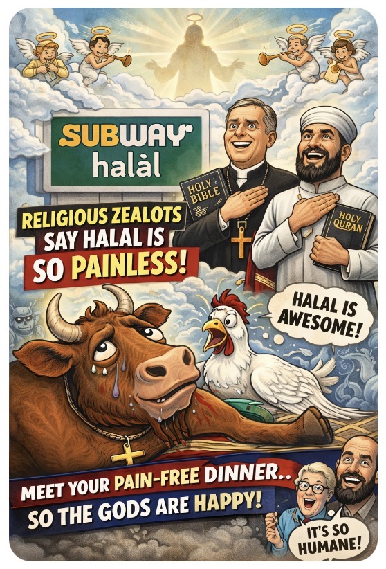 No one’s forcing you to order halal chicken. No one’s banning your meatball marinara. And no, the cookie display hasn’t been replaced with a sermon. This is religion doing what religion does: making the murder of animals somehow spiritual, just not for the animals.