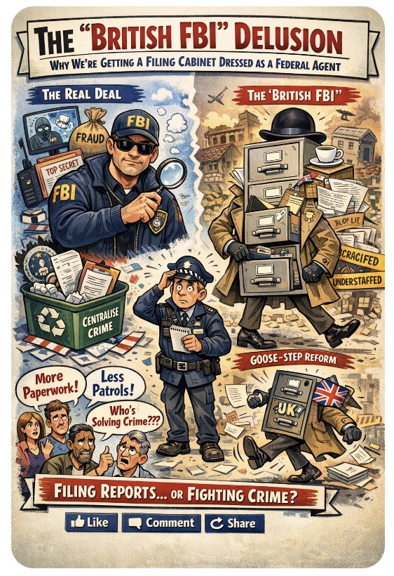 And here’s the kicker: in the U.S., the FBI avoids replacing local police. Meanwhile, in the UK, we’re marching in the opposite direction with the grace of a goose-stepping filing cabinet. Because nothing says “modern crime-fighting” like another layer of forms, flowcharts, and flowery press conferences.