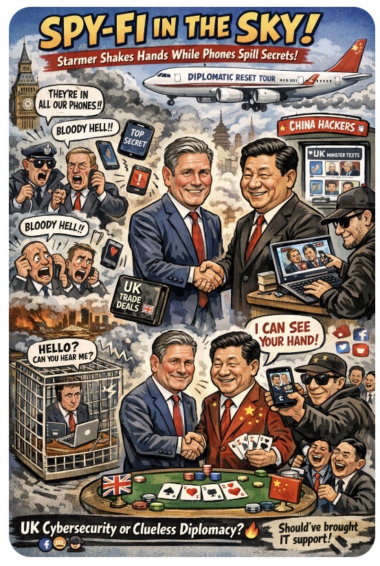 Sir Keir arrives with a firm handshake and hopeful trade agreements; behind him trails a smoke cloud of digital espionage so thick, MI5 could probably taste it. While UK officials daydream about strategic dialogue and export deals, Chinese-linked hackers may have already downloaded the meeting agenda, calendar invites, and someoneβs awkward karaoke video from the last G7 summit.