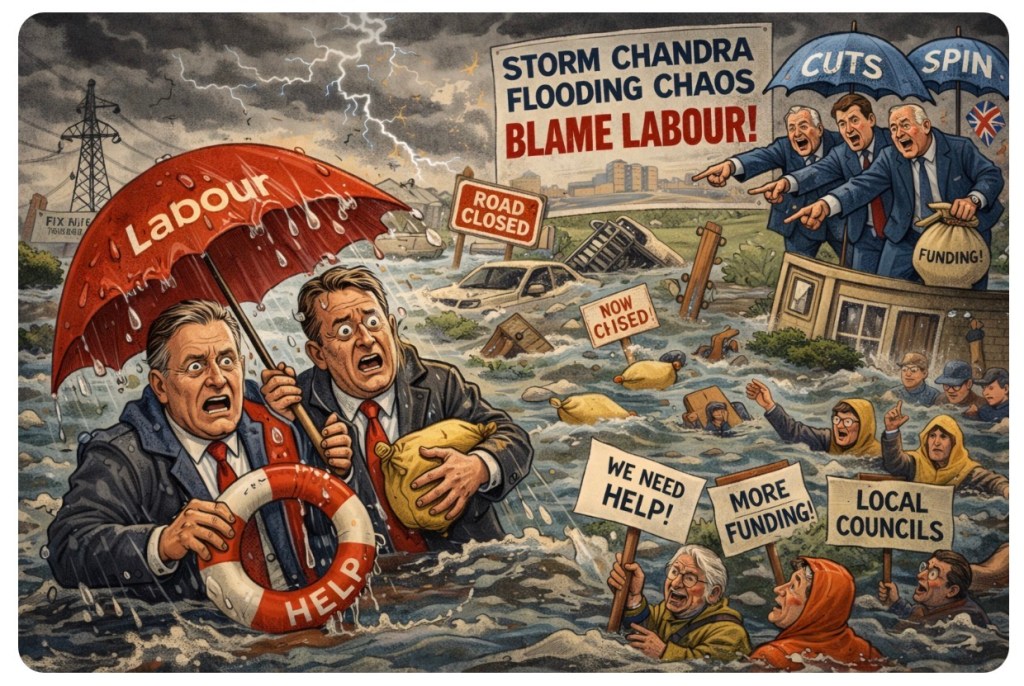🌧️🧯As Britain sinks beneath Storm Chandra’s soggy tantrum, Labour is being scapegoated faster than a sandbag at a Tory press briefing. Roads closed, power out, schools shut—so naturally, someone’s got to eat the lightning bolt.