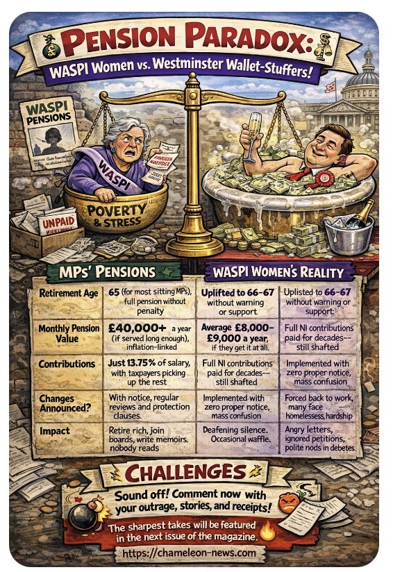 While millions of WASPI women face poverty, stress, and broken promises, our beloved Members of Parliament are swimming in the gold-plated pension jacuzzi—bubbling with privilege, topped off with taxpayer-funded bubbles. Let’s break down the brutally absurd comparison of what each gets when they retire, or in the case of MPs, when they just stop pretending to work.