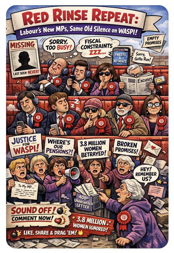 🔁💄Twenty-five shiny new Labour MPs marched into Parliament with progressive promises and soft-focus manifestos. And yet, when it came to supporting the long-suffering WASPI (Women Against State Pension Inequality) campaigners—women robbed of their retirement rights by stealth—they collectively performed the political equivalent of a disappearing act. Poof. No motion. No spine. Just a flurry of tweets about “listening to communities” while ignoring a generation of women who were very loudly telling them exactly what needed fixing.