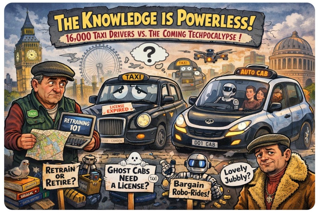 - Retraining for Taxi Drivers? Oh, you mean the plan to turn lifelong cabbies into part-time coders or Deliveroo warriors? Sure. Because after memorizing 25,000 London streets and surviving the traffic trauma of Elephant & Castle, who wouldn’t want to reskill into data entry or drone repair?