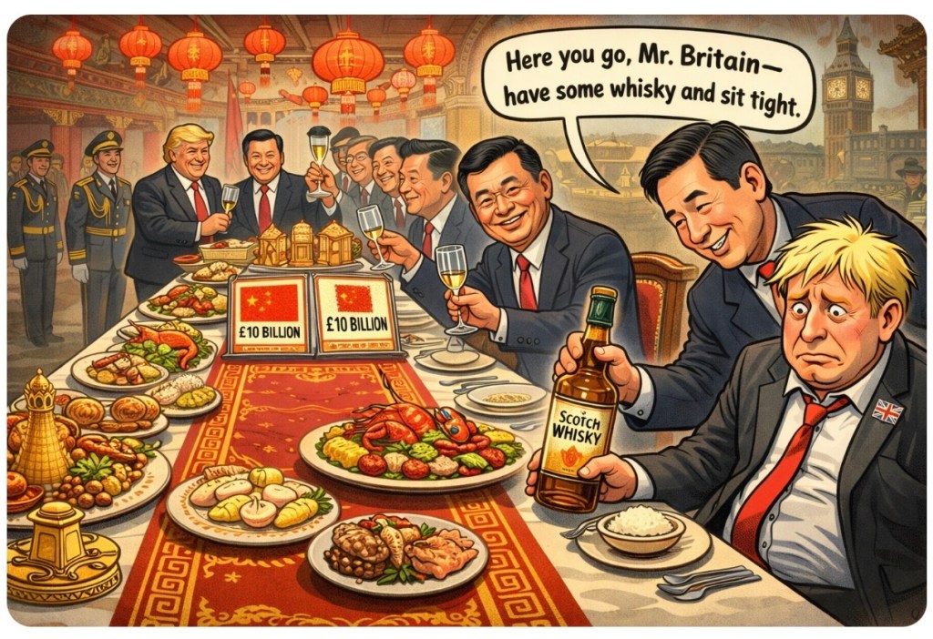 Imagine sitting at the international poker table. China lays down royal flush-level trade agreements. Britain clinks a glass and says, “But have you tried our smoky Islay single malt?” That’s right—while China walks away with infrastructure deals, tech investments, and a property portfolio that’d make Monopoly jealous, Britain’s big win is fewer tariffs on booze.