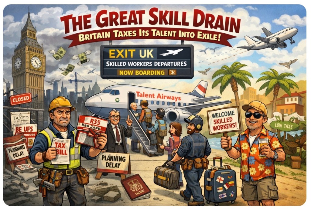 🧳🔧In a nation desperate for housing, energy transition, and infrastructure resilience, the UK has found a bold new solution: chase out the very people who could build it. Top tradespeople—from master electricians to renewables engineers—aren’t leaving because they’re lazy, woke, or lured by avocado toast. They’re leaving because Britain’s reward for excellence looks like a bureaucratic migraine wrapped in a tax bill.