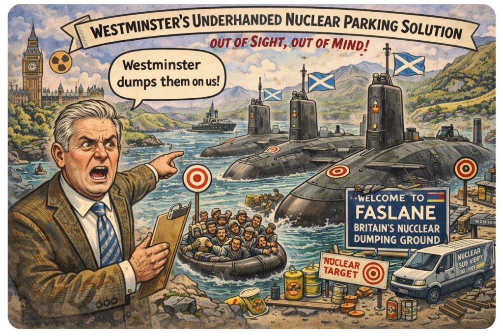 Youβve really got to hand it to Westminster β not for transparency, decency, or planning, but for the sheer audacity of their logistical genius. βLetβs not park our fleet of nuclear subs near the seat of power,β they mutter in some chandeliered room, βletβs put them up northβ¦ somewhere with more sheep than scrutiny.β And voilΓ : Faslane becomes Ground Zero in the most underhanded postcode lottery in British history.
