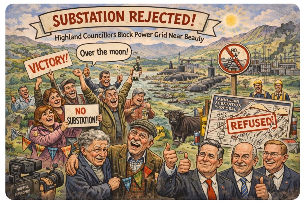 In a rare twist where democracy actually worked, Highland councillors just did something outrageous: they listened to the locals. Objectors in Beauly are βover the moonβ (and not just because thereβs still no substation there beaming EMFs into their begonias).