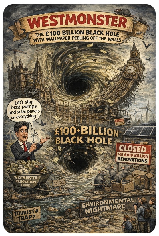 Itβs official: Westminster isnβt just crumblingβitβs gravitationally collapsing into itself. Engineers have apparently discovered a new kind of black hole, not in deep space, but on the banks of the Thames, where renovation estimates start at Β£40 billion and conveniently forget to mention the β+Β£60 billion contingency for surprise asbestos and medieval rodents.β