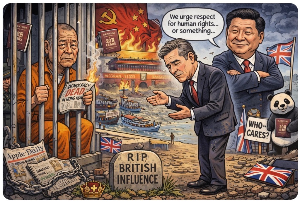 Letโs connect the dots with a pen dipped in diplomatic cowardice: Jimmy Lai โ founder of Apple Daily, lifelong champion of free press, and holder of a UK passport, which means absolutely nothing to any other countryโ has now been sentenced to two decades in prisonโฆ for encouraging democracy.