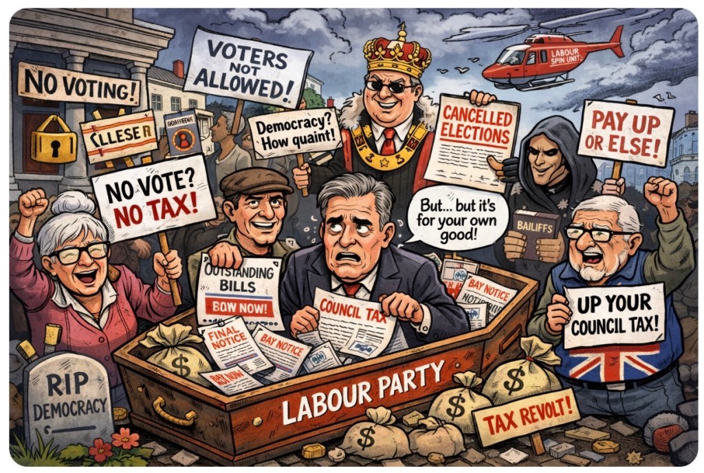 Forget pitchforks — the revolution will be itemised. A rising wave of council tax rebels is saying “No vote? No payment!” as local elections vanish like Tory accountability. And if this movement spreads? Labour might be on track to democracy-deny itself into political oblivion.