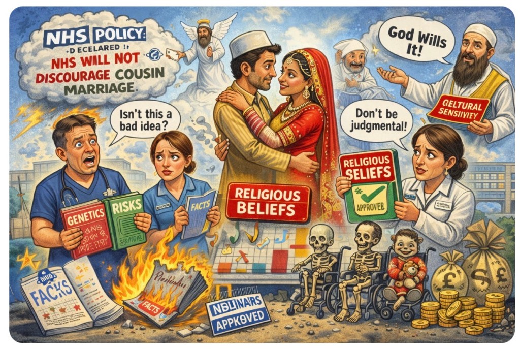 Just when you thought the NHS had enough on its plate—like staff shortages, surgical backlogs, and the occasional collapsing ceiling—they’ve now been advised to stop discouraging first cousin marriages. Yes, you read that right. Because in 2026, truth must apparently yield to “cultural sensitivity”—even if it means tossing basic genetics into a burning bin labeled “Offense Avoidance.”
