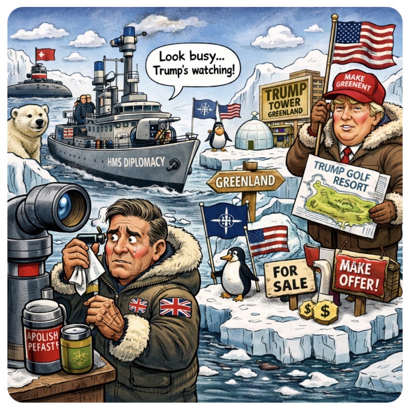 ❄️🚢🇬🇧Sir Keir Starmer has unveiled a frosty new focus for the UK’s military: more Royal Navy patrols around Greenland. Why? Because somewhere between NATO briefings and Truth Social posts, the President of the United States floated the idea that Greenland might look better draped in Stars and Stripes.