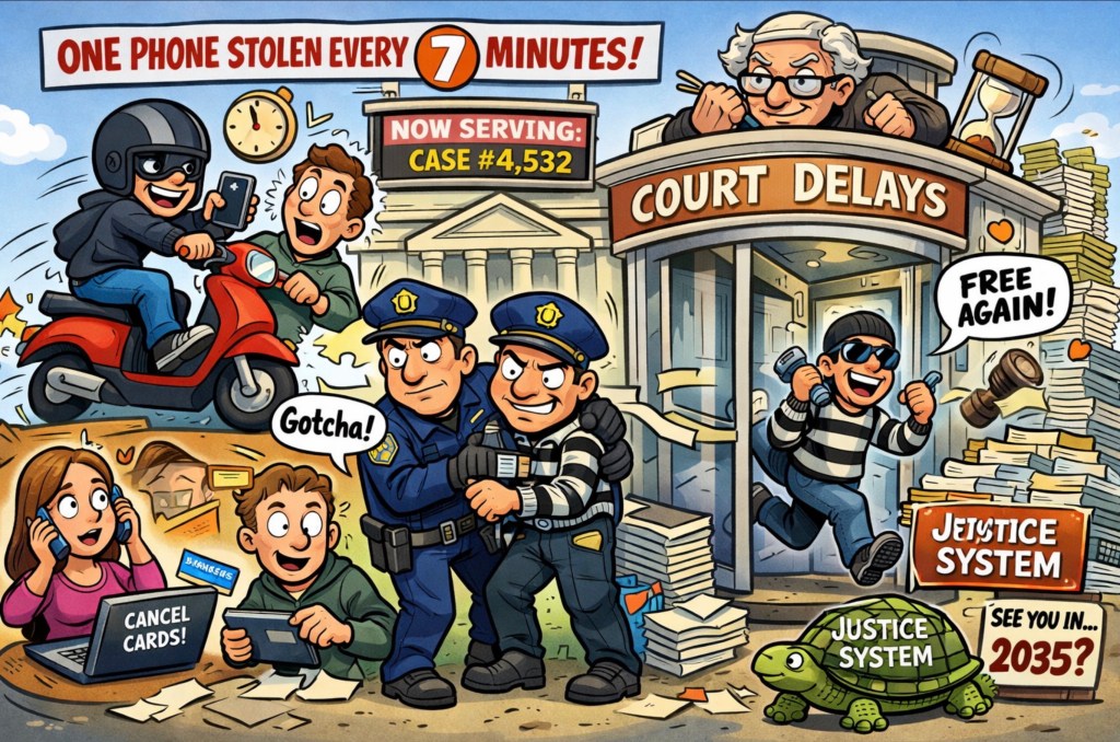 The police say they’re making a “concerted effort.” And to be fair, they are catching thieves. The problem? The revolving courtroom door spins faster than the getaway scooters. Officers grab them, process them, march them to court — and then the legal backlog politely escorts them back into the wild. Justice delayed isn’t just justice denied… it’s justice reissued with a fresh SIM card. 📦⚖️