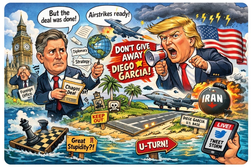 🏝️💥Just when Keir Starmer thought the diplomatic waters were calming, along comes Donald Trump with a megaphone and a mood swing. The subject? The spicy little sandpit known as the Chagos Islands — specifically Diego Garcia — the strategic airbase that’s less “tropical getaway” and more “geopolitical launchpad.”