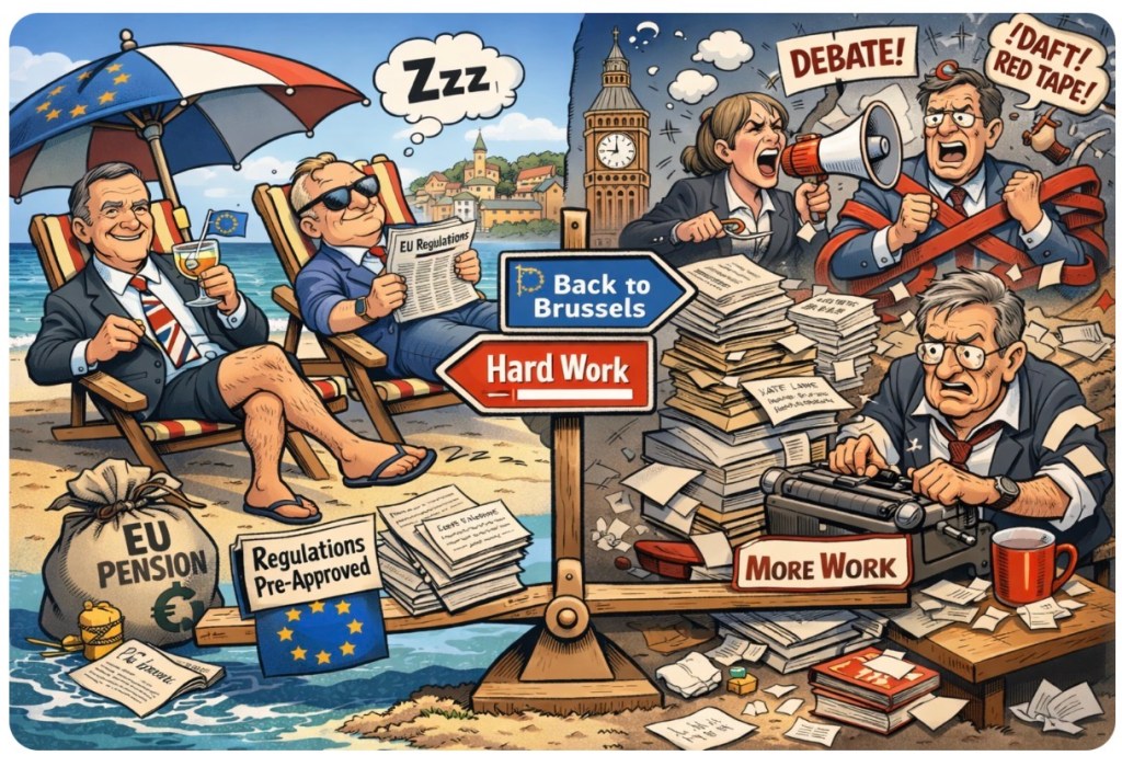After all, when rules are harmonised and frameworks pre-written, that’s fewer late nights drafting bespoke British regulations. Fewer awkward debates. Fewer line-by-line legislative wrestle-mania sessions in the Commons. Why write the essay when you can co-sign the group project? 📝🤝