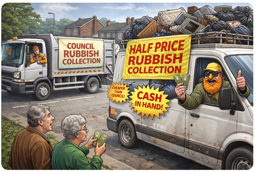 Residents, squeezed for every last quid, look at the “official” disposal fee and think: Surely there’s a cheaper way? Enter the unofficial waste management sector—cash in hand, no receipt, no questions asked. What could possibly go wrong? 😬