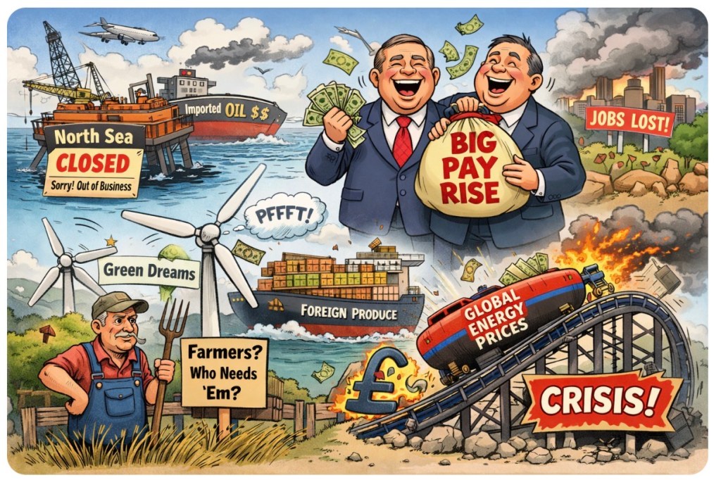 🛢️🌬️💸A government masterclass in strategic brilliance: close down domestic energy, rely on foreign oil, antagonise the farmers who grow the food, and then—because excellence deserves recognition—vote yourself a pay rise. If irony generated electricity, Britain would already be energy independent.