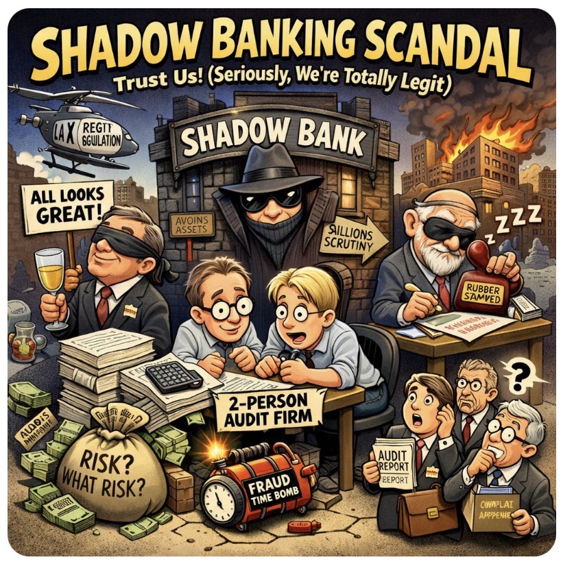 🏦🕶️Every financial disaster seems to begin the same way: a complex structure, billions in assets, impressive jargon… and somewhere in the middle, a suspiciously tiny gatekeeper quietly nodding everything through. Welcome to the world of shadow banking—where institutions act like banks, lend like banks, and move money like banks… but without the pesky inconvenience of proper banking rules.