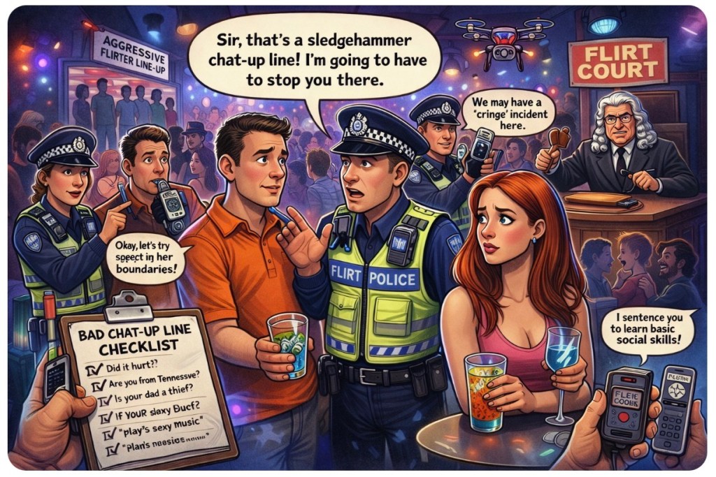 🍸🚨Just when you thought British nightlife had already been regulated to death by queues, wristbands, and bouncers with the personality of airport security, along comes the next frontier of public safety: government-backed nightclub vigilance against bad chat-up lines.