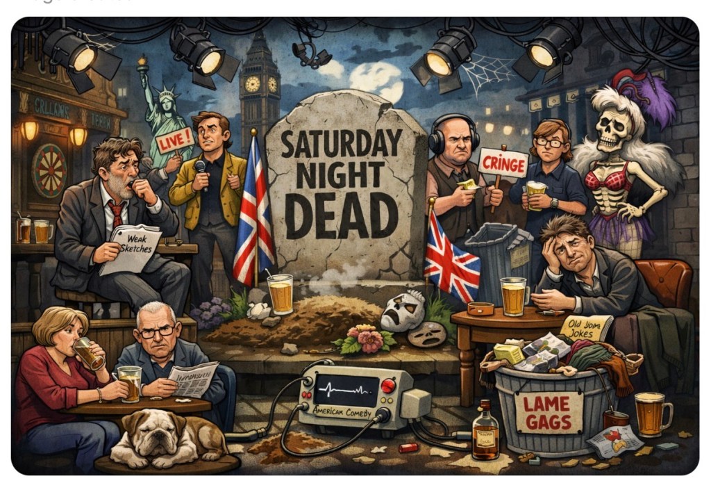The UK didn’t just import Saturday Night Live—it dragged it into a cold pub at closing time, handed it a flat pint, and told it to “do the funny thing.” What we got? A format gasping for cultural oxygen while politely apologising for existing.