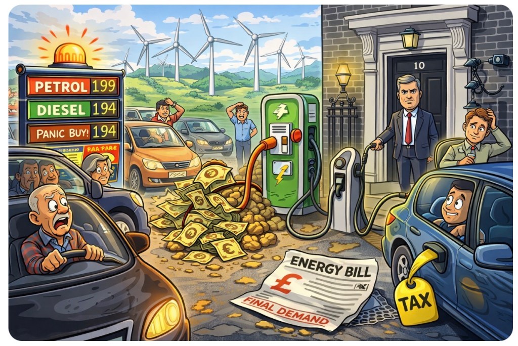 As Downing Street braces for panic at the petrol pumps, the real panic might be happening in people’s bank accounts. Prices soar, pressure mounts on Sir Keir Starmer, and the public is left wondering: if we’re surrounded by wind turbines, why does it still feel like we’re paying for dinosaur juice? 🦖💸