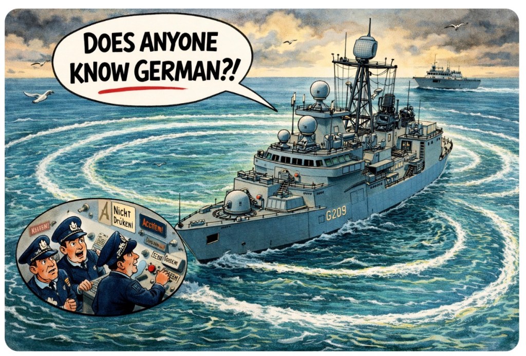 British sailors step aboard, ready to defend the realm… and are immediately confronted with a wall of German labels, manuals, and controls.