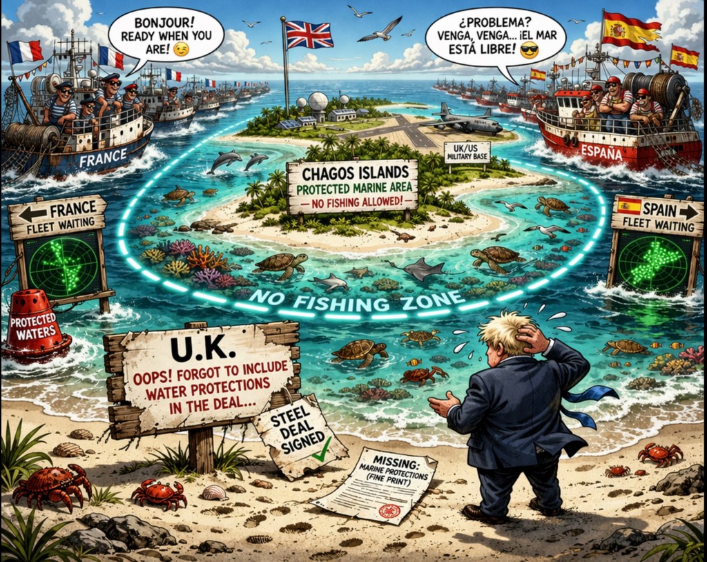 📄🤦♂️🎣Just when you thought the Chagos situation couldn’t look any more like a group project where no one read the brief—along comes another gem: failing to lock in water protections as part of the broader deal… while French and Spanish fleets hover like it’s opening day at an all-you-can-eat ocean buffet.