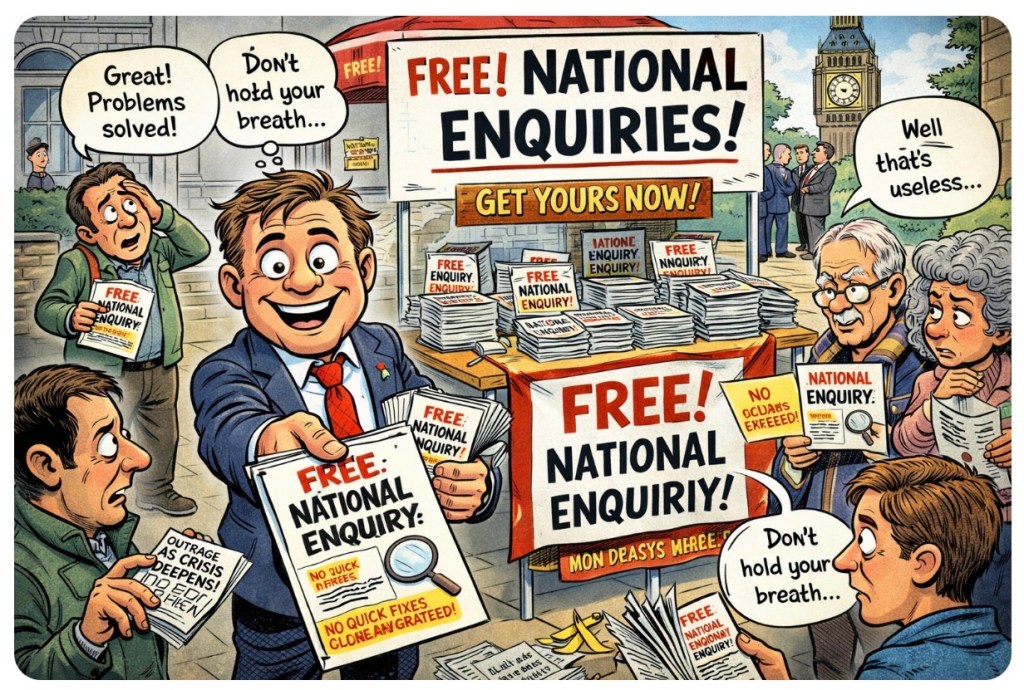🕵️♂️📄Ah yes, the “National Enquiry”—that magical phrase politicians deploy when things have gone so catastrophically wrong that someone has to look like they’re doing something. Preferably something that takes years, costs millions, and concludes long after everyone involved has retired, resigned, or conveniently forgotten. 🇬🇧✨