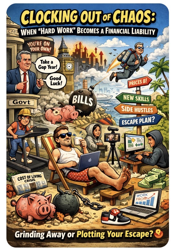 So what’s the plan for the average Brit? Keep grinding while your rent eats your soul? Or… boldly step off the hamster wheel and treat this economic circus like an involuntary sabbatical? Because apparently, survival now requires strategy, not just stamina.
