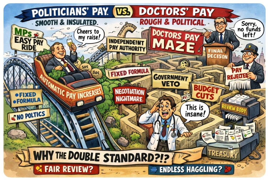 While MPs glide along a tidy, formula-driven pay track overseen by the Independent Parliamentary Standards Authority, doctors are left navigating a political obstacle course where “independent review” sounds reassuring—right up until the government bins the recommendation. Welcome to Britain’s favourite institutional contradiction: precision economics for politicians, vibes-based budgeting for the people keeping you alive.