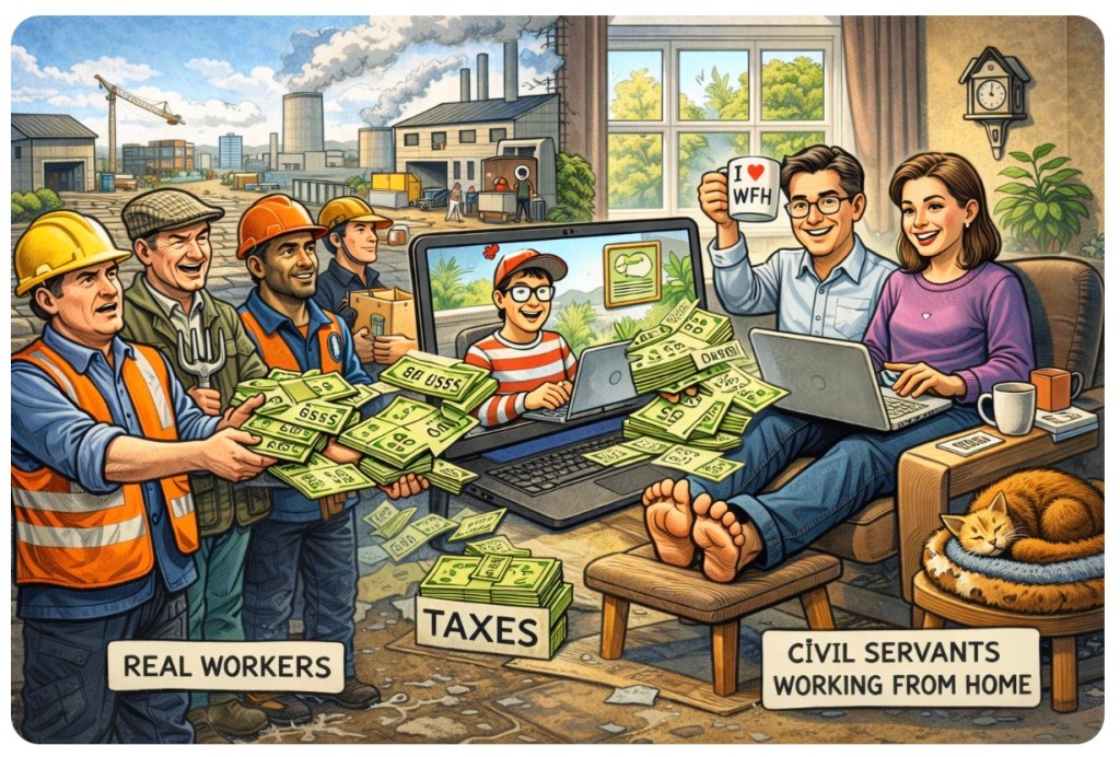 Those funding public sector salaries through taxes often don’t get the same perks. No duvet-adjacent desk. No midday laundry cycle disguised as “admin.” Just alarms, shifts, and showing up—physically.