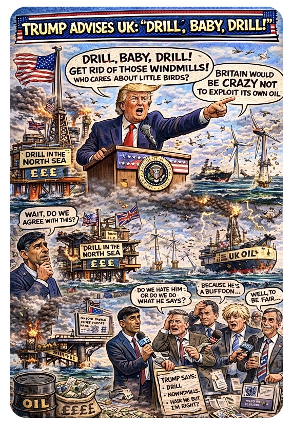 Donald Trump has weighed in—loudly, predictably, and with all the subtlety of a foghorn—declaring Britain “crazy” for not squeezing every last drop out of North Sea oil. His message? “Drill, baby, drill”… and while you’re at it, maybe knock down a few wind turbines for good measure.