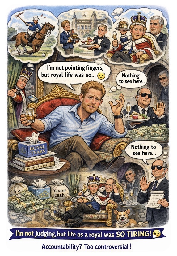 👑🎭Prince Harry has once again stepped forward—gently, bravely, and with the softest of kid gloves—to explain that he’s “not judging” his father, King Charles III… but also that growing up royal was, frankly, a bit of an emotional marathon. Exhausting, really. All that polo. All those palaces. The sheer burden of being waited on hand and foot. 😮💨
