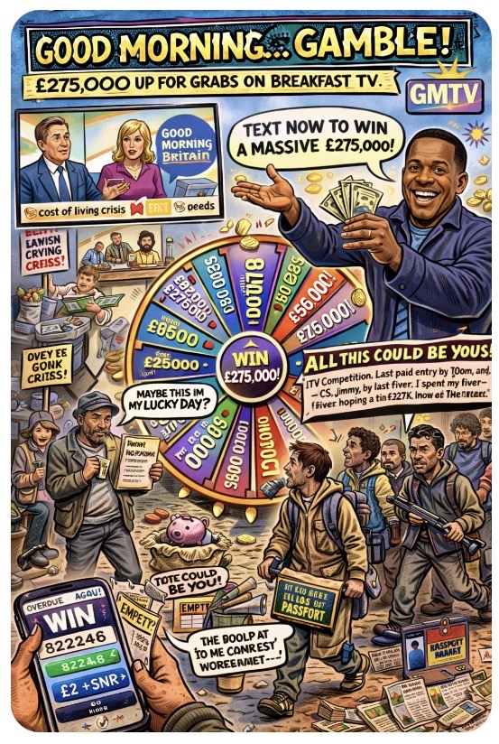 Ah yes, the sacred ritual of morning television—coffee in hand, toast half-buttered, and a cheery host casually dangling life-changing cash prizes like a carrot in front of a nation already juggling bills. Welcome to the glittering paradox of Good Morning Britain, where social issues are discussed with furrowed brows… right before cutting to “WIN £275,000 NOW!!!” flashing like a Vegas slot machine on caffeine.