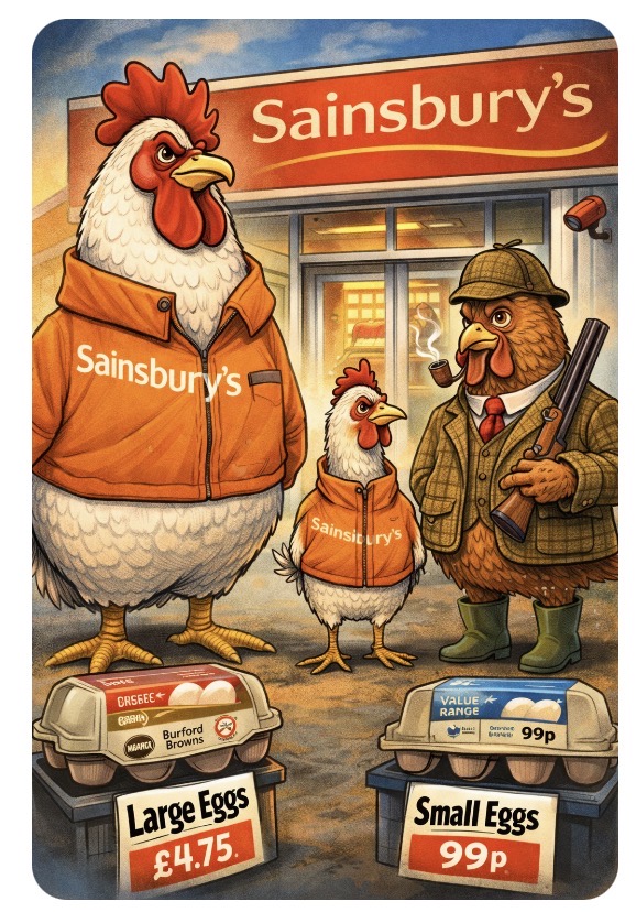 Somewhere between “cage-free” and “organic heritage aristocrat hen,” eggs have developed a full-blown class system. Big chickens for big spenders. Modest hens for the rest of us. And if you dare to promote your eggs socially—slipping them into a Burford Browns box like they’ve just been knighted—you’re now a suspect in Britain’s most fragile criminal underworld. 🚔🥚