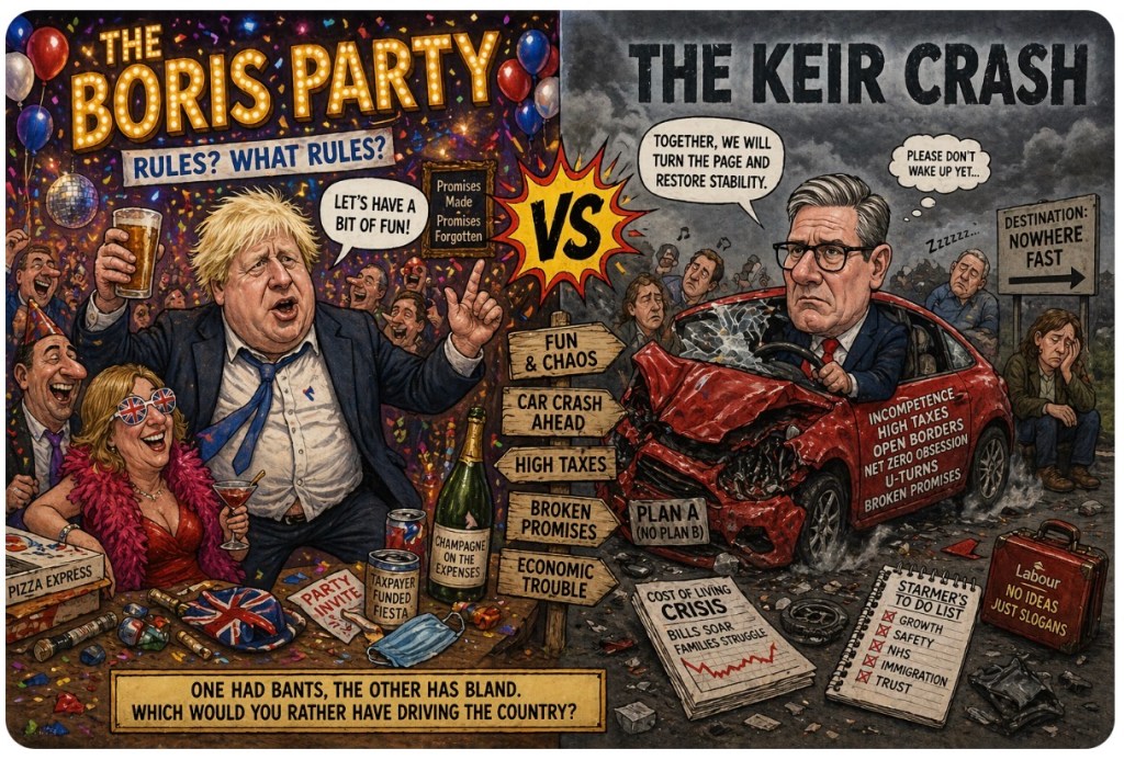 Meanwhile, Sir Keir has taken a bold new approach: remove all detectable traces of excitement and hope the nation quietly stabilises out of sheer boredom. If Boris was fireworks, Keir is a spreadsheet. If Boris was a stag party, Keir is the risk assessment form you fill out beforehand. 📊
