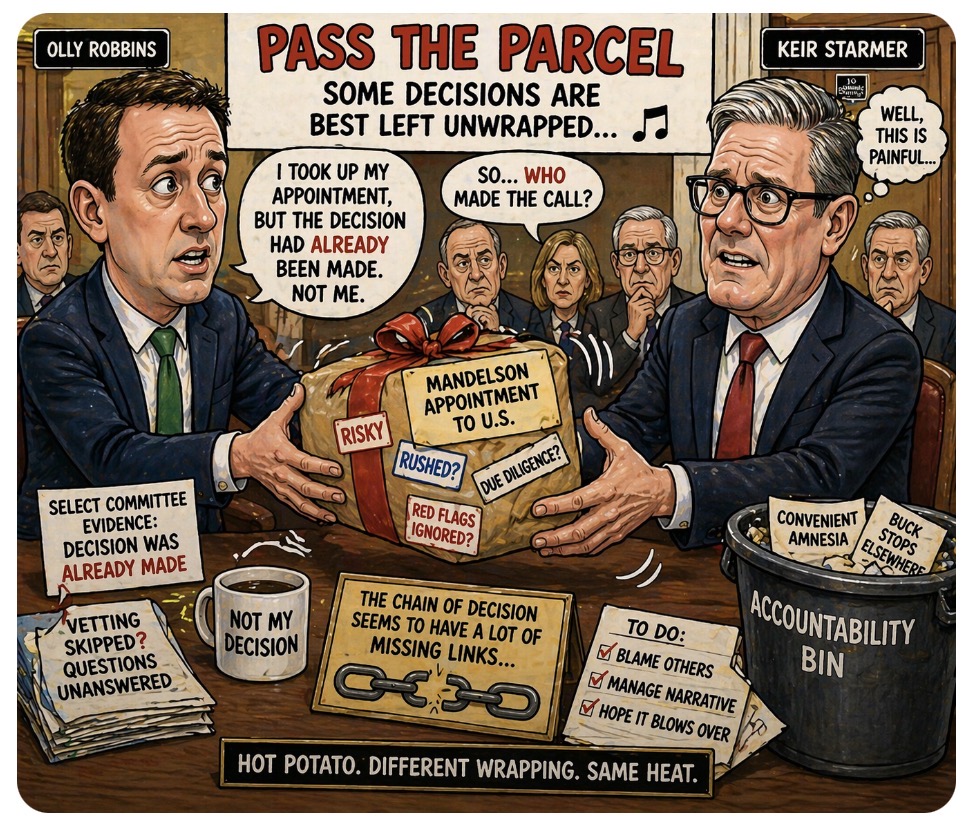 Well, that didn’t take long. Just when it looked like the fallout might be neatly contained, Olly Robbins steps into a select committee and effectively says: “Not my call—it was already done when I arrived.”