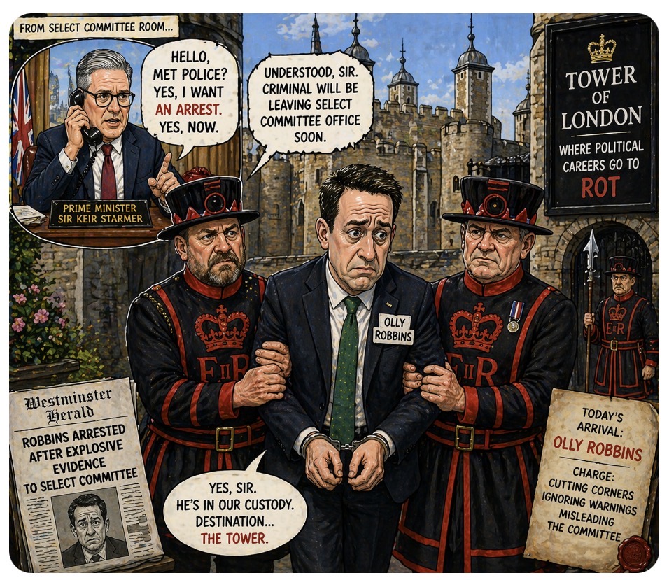In a shocking development, Olly Robbins has reportedly been marched off to the Tower of London by a pair of grim-faced guards, as Westminster briefly decided the 21st century was overrated.