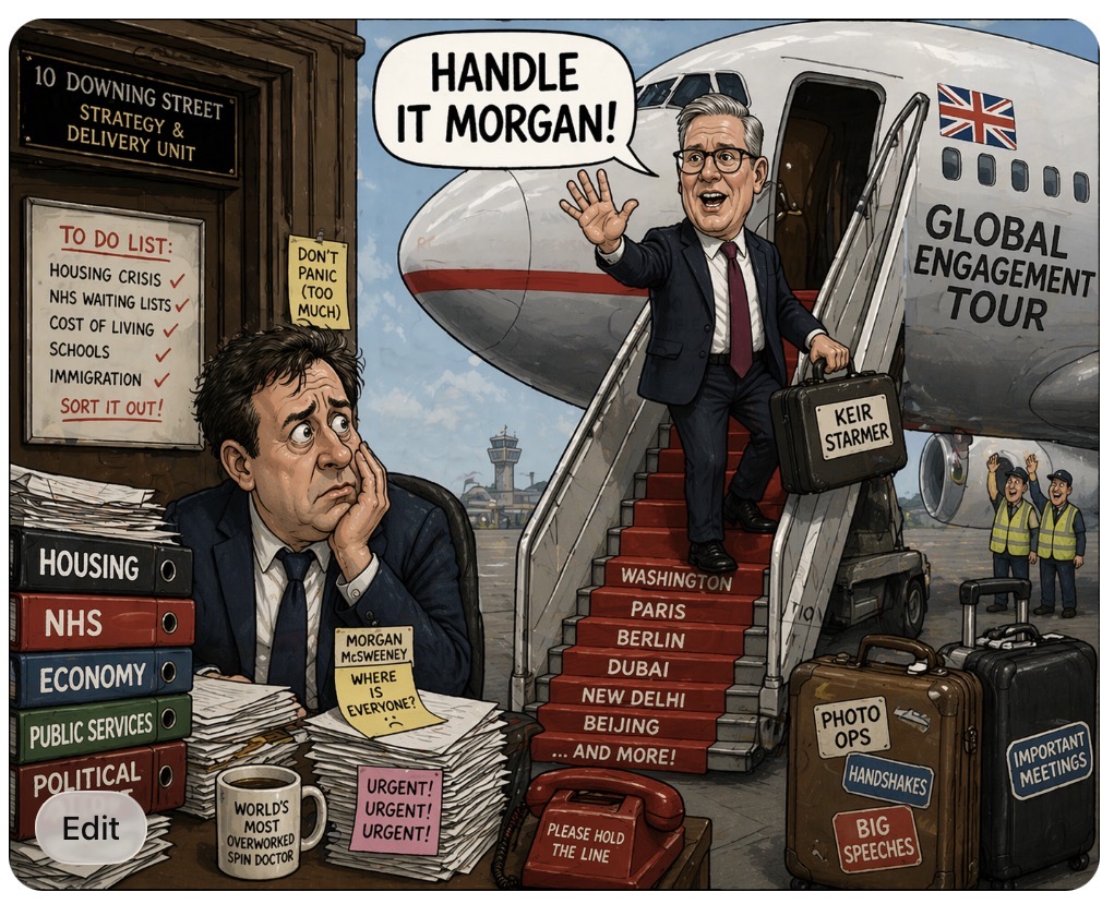 According to Emily Thorburn, there’s a lingering question over who’s actually been steering the ship. Her suggestion? That Morgan McSweeney might have been left holding the clipboard while others were busy globe-trotting, shaking hands, and collecting photo ops like Pokémon cards.